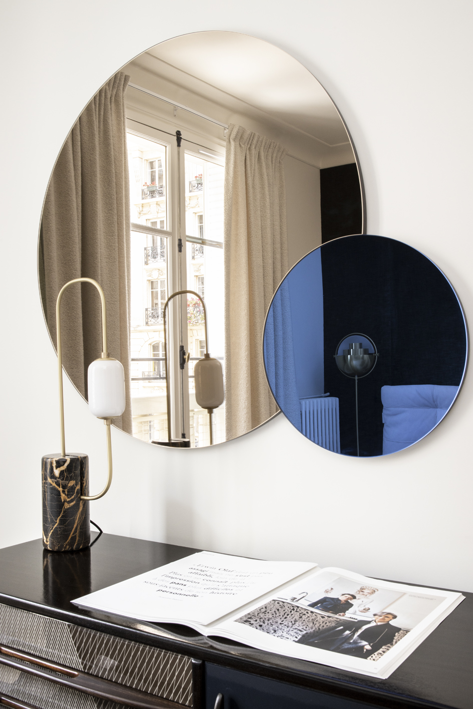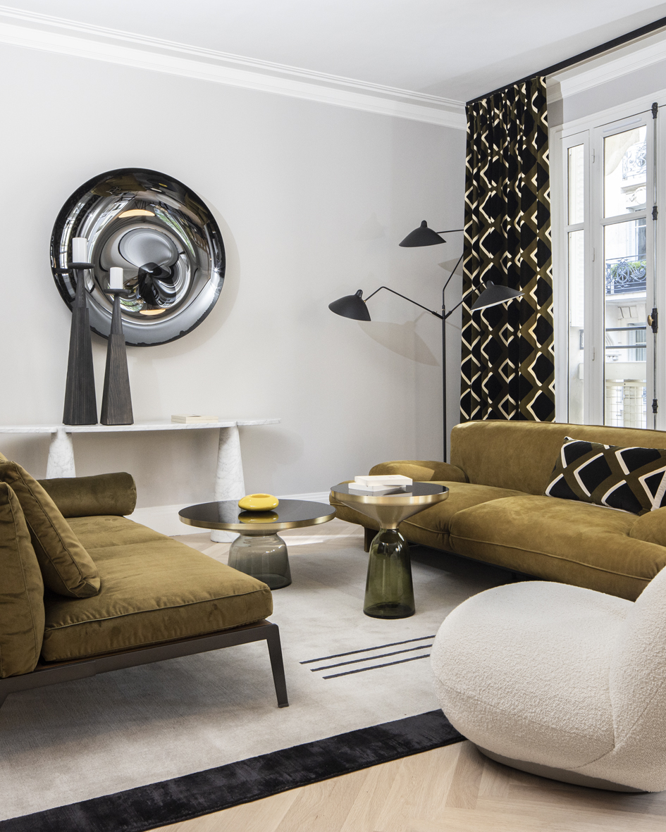 Un écrin blanc cassé qui va accueillir et mettre en scène les créations de nos éditeurs favoris. Le salon se construit autour du canapé Bardot de Baxter dans une couleur de cuir Kiwi qui donnera le ton et résonnera avec la banquette en velours de Flexform et 4 rideaux d’India Mahdavi pour Pierre Frey. Quelques pièces fortes ultra créatives ponctuent avec brio ce scénario : La console Eros d’Agape Casa d’Angelo Mangiarotti, le miroir de Kiko Lopez et la B-Light dessinée par Dan Yeffet pour Collection Particulière.