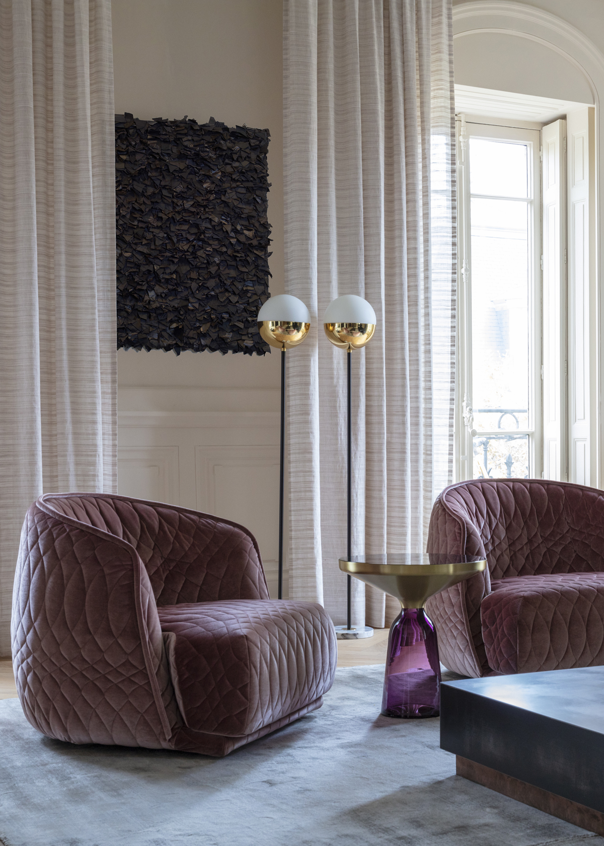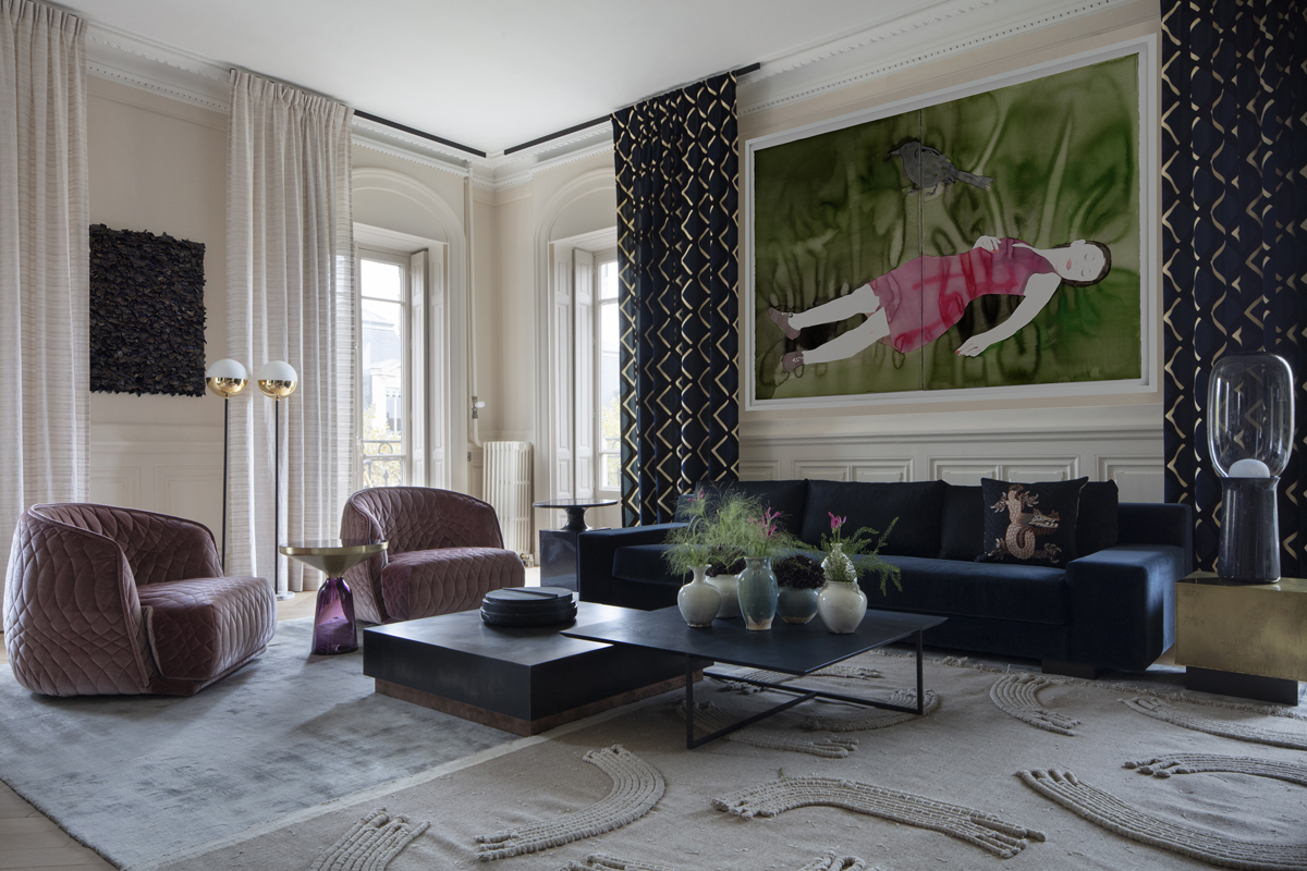 Des fauteuils Redondo de Moroso en velours, un canapé de velours, et des rideaux de velours …. Matières douces et sensuelles répondent à l’envie de la cliente d’un lieu chaleureux.