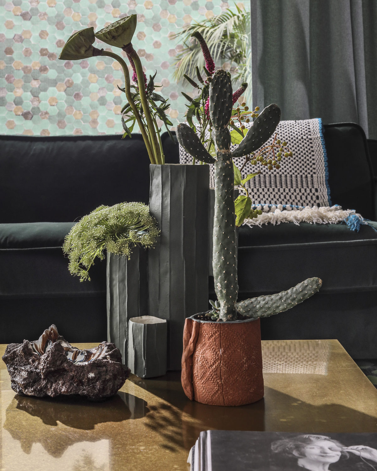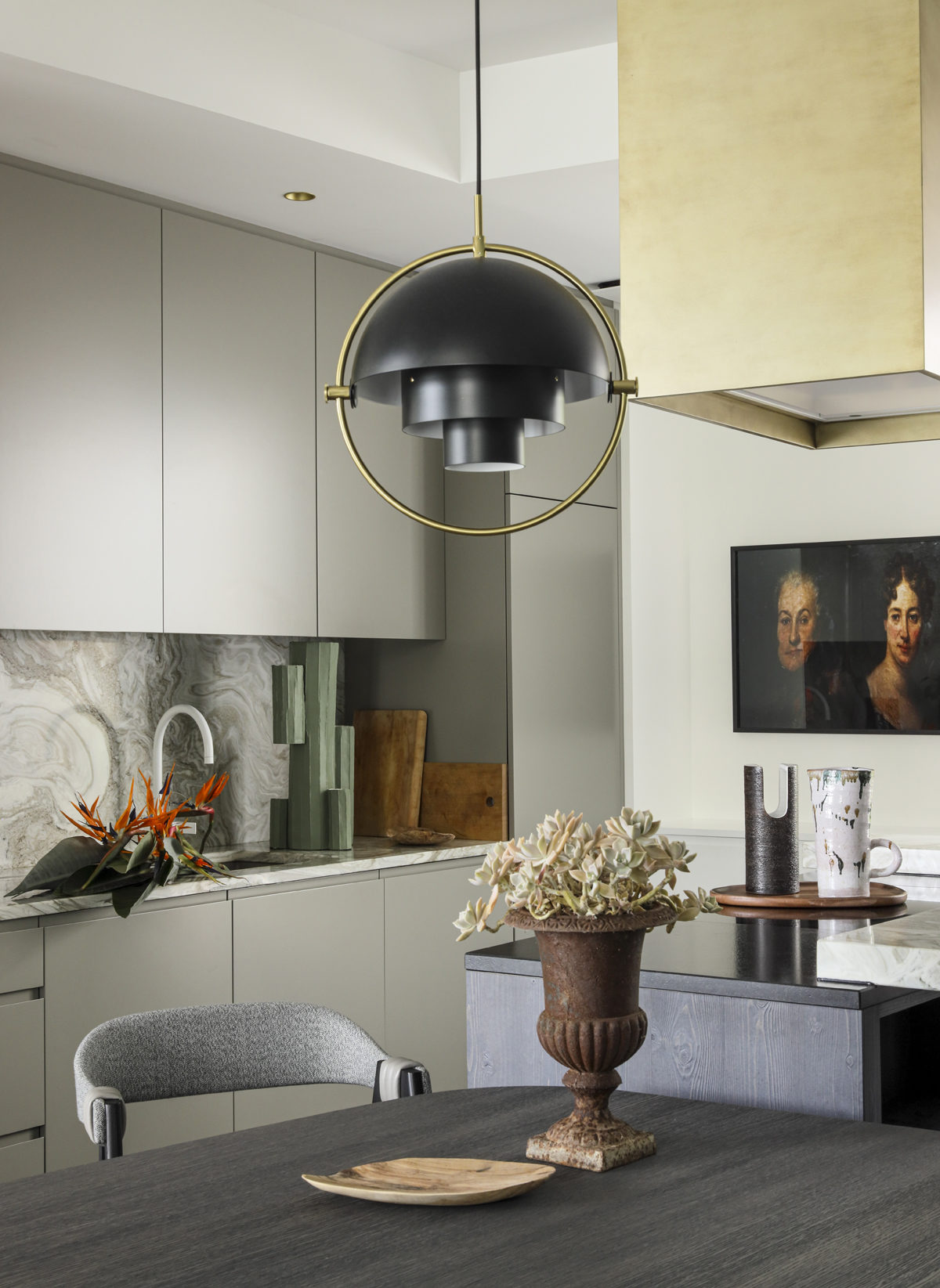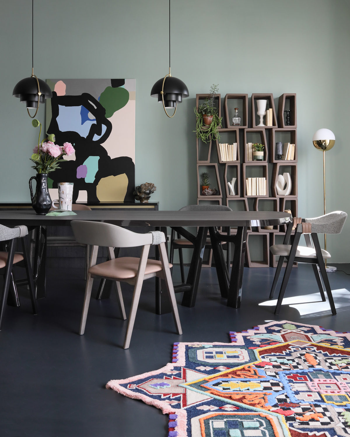 Une palette de verts tendres, vert d’eau, vert menthe répondent aux arbres de l’extérieur et aux subtiles nuances de la Saône. Une cheminée audacieuse, promesse de soirées tranquilles, casse l’alignement des baies vitrées. Une sélection exigeante de mobilier design, coups de coeur des clients correspondent divinement à ce scénario. Table sculpture YBU de Christophe Delcourt, tapis Arty de CC TAPIS et GOLRAN, baquette LEK de Collection Particulière et canapé de Meridiani.