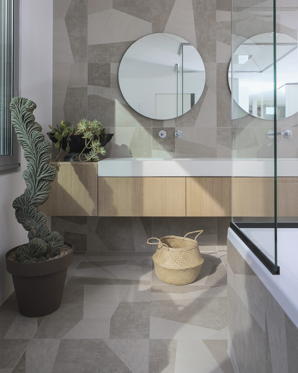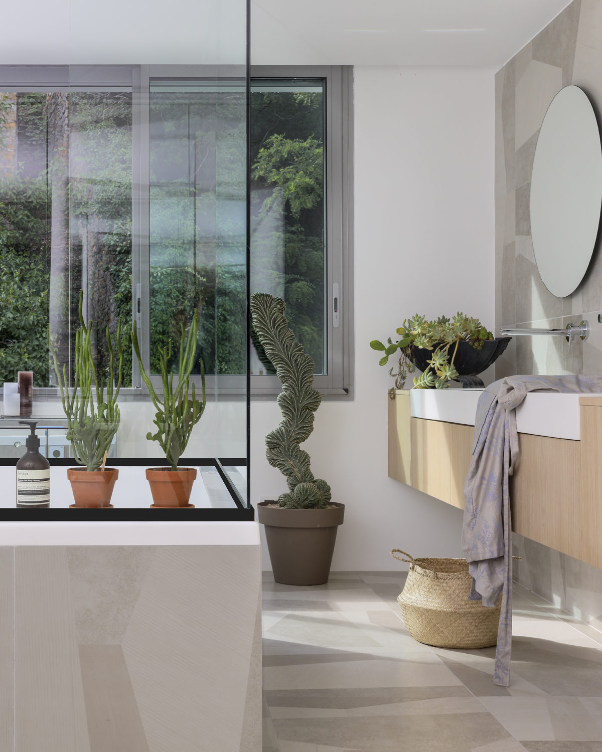 Là plus de couleurs, une palette de dégradés naturels blanc laiteux, lumineux, des matières douces comme le plaid en laine de MOROSO ou la bouclette de laine de Dedar sur le fauteuil Pacha de Pierre Paulin. La salle de bains et sa baignoire XXL parait perdue dans la nature, le sol et son carrelage Palladiana de Studio Pepe déroule une douce géométrie.