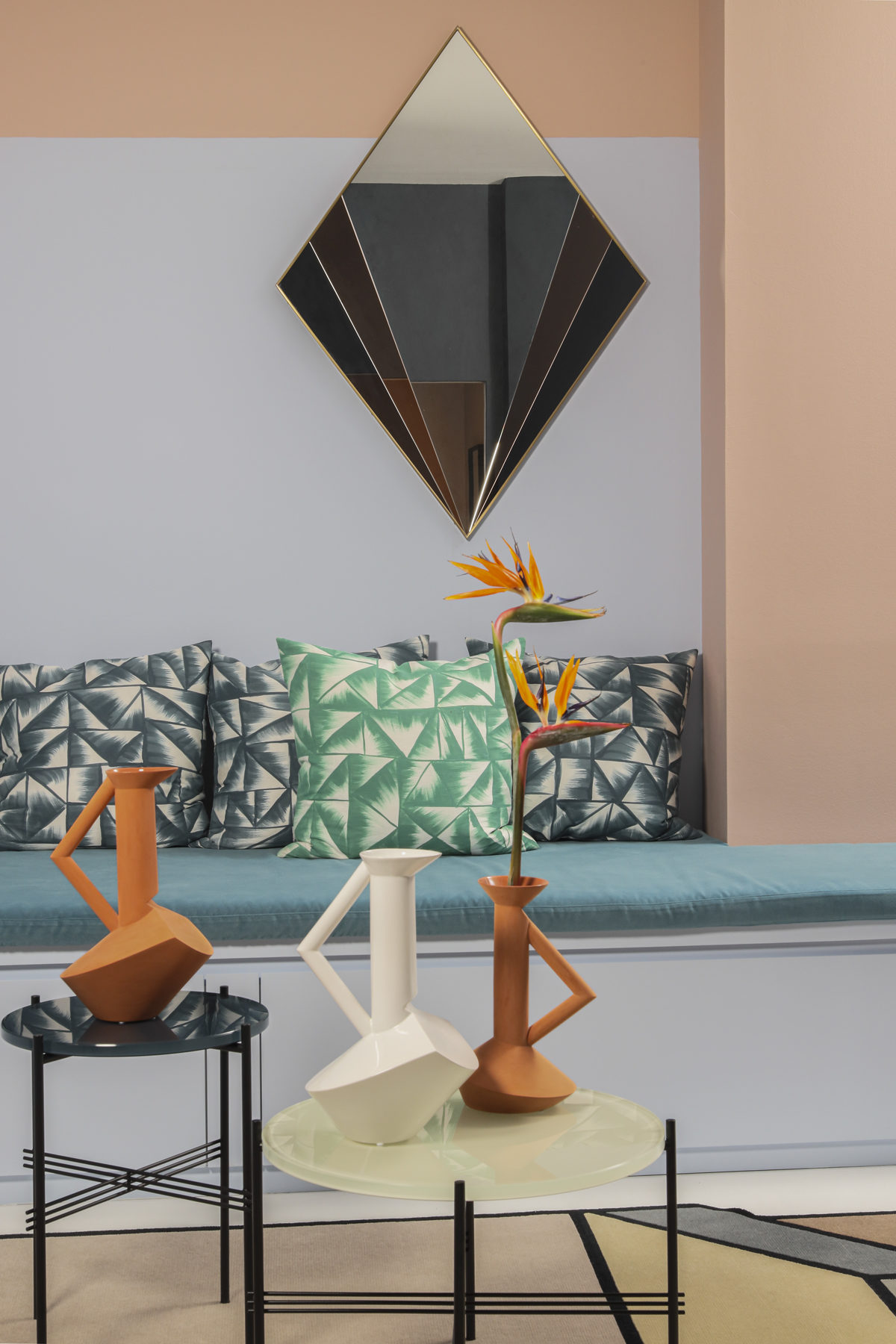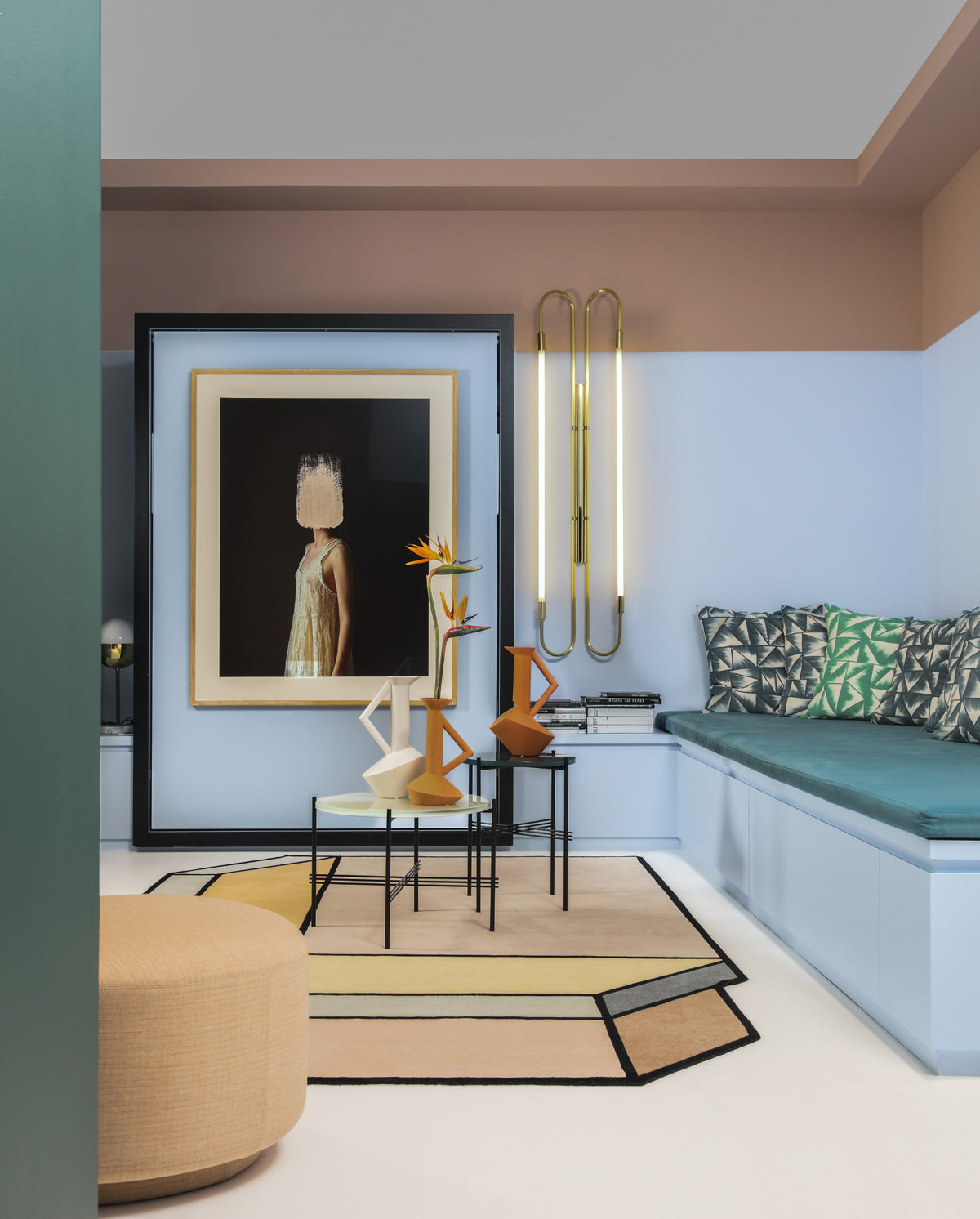 Chaque niveau allait nous donner le tempo à suivre. Le rez de chaussée, presque sans lumière naturelle devait balancer tout de suite la note et donner le ton de la maison. On décide bâtir un scénario s’appuyant sur les géométries déjà existantes et on repart avec en trompe l’oeil le panoramique de Texturae, des couleurs fortes et pop verts et roses cohabitent à une scène joyeuse, design et forte.